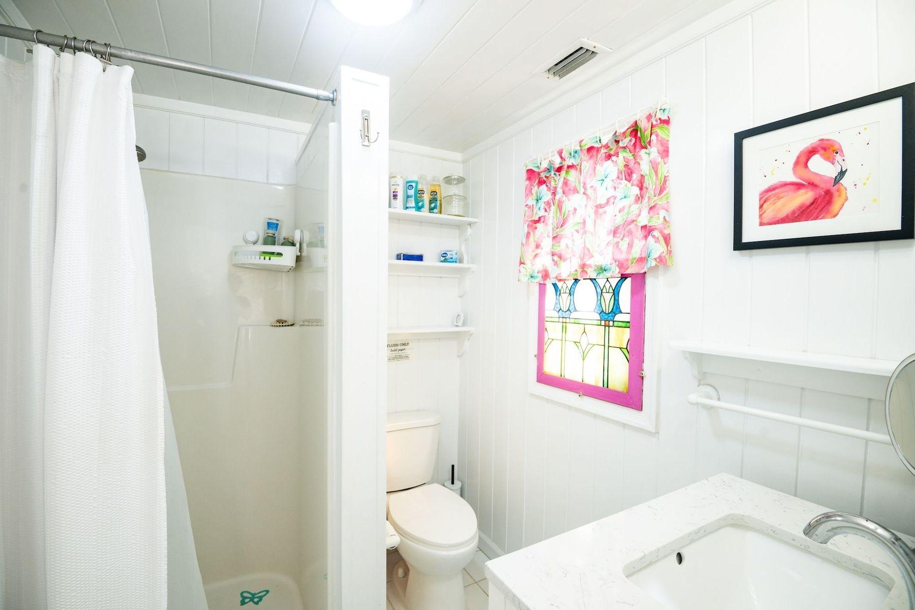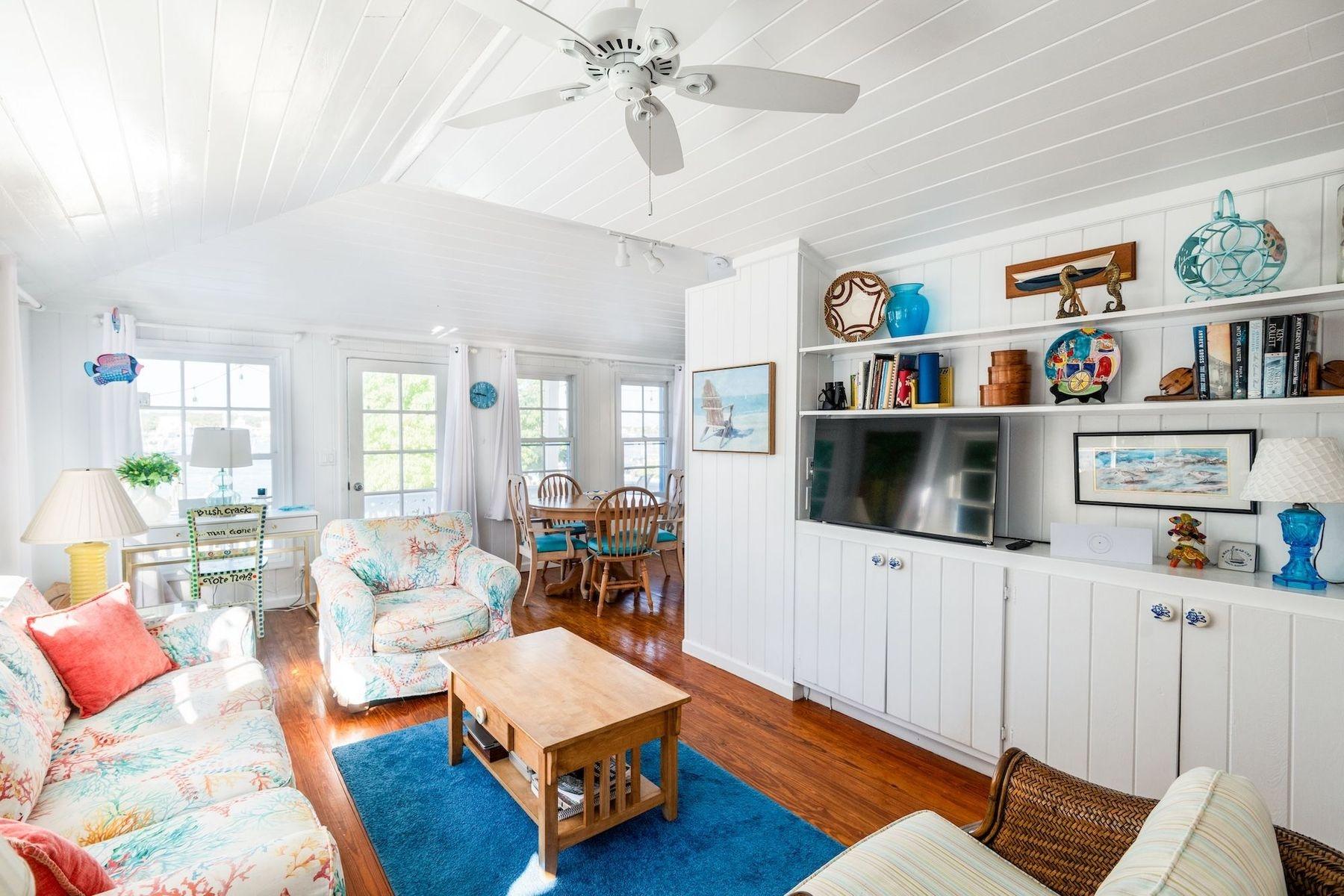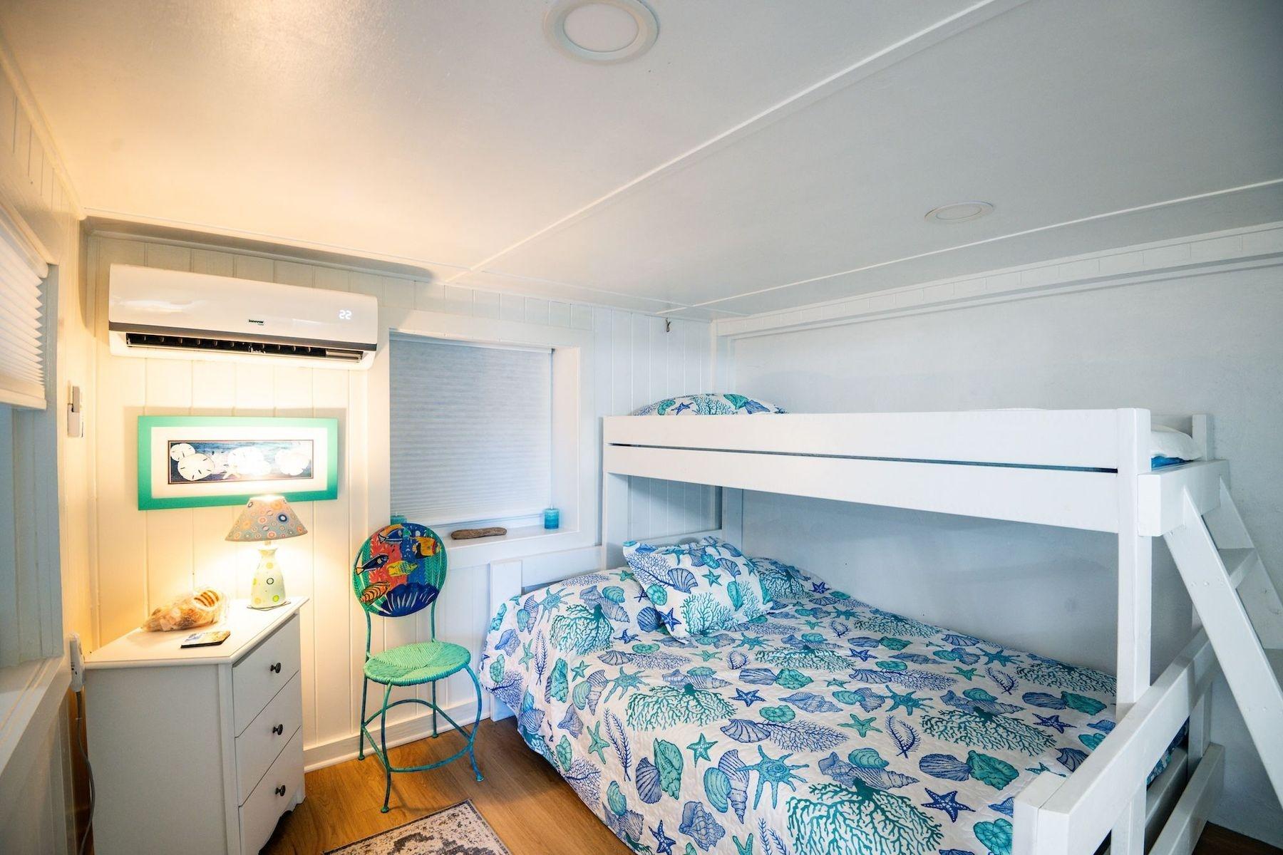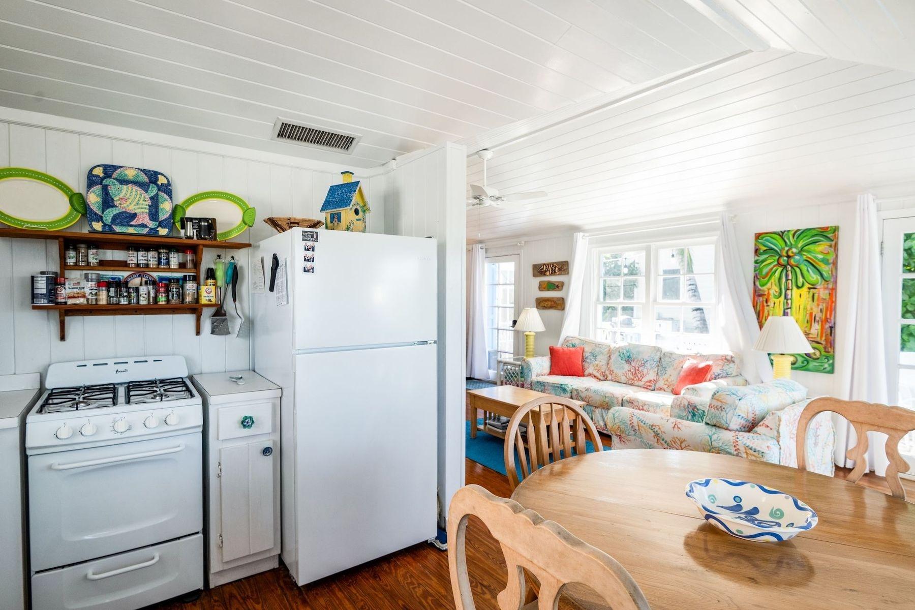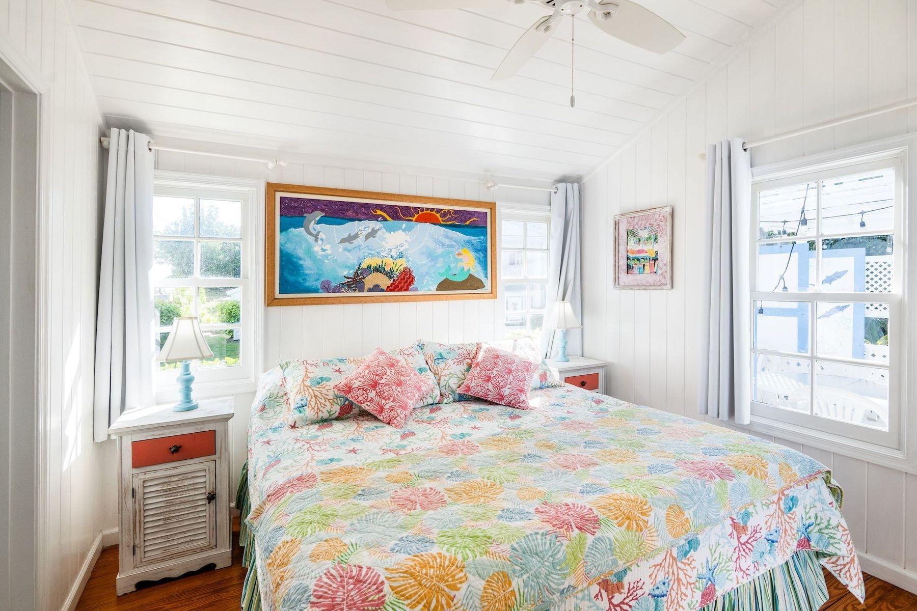 Bright, airy, and colourful home in the heart of Hope Town with postcard-perfect Elbow Reef Lighthouse views. The property has excellent storage and a flexible downstairs space, plus true boater appeal: private dock + parking and the ability to “pull your boat right up.” Layout has a kids’ bunk area, two king bedrooms—one ensuite—plus an extra full bath. Down stairs in the private bunk rooms, with access to basement, storage area for bikes & a basement with even more storage area plus a washer/dryer.