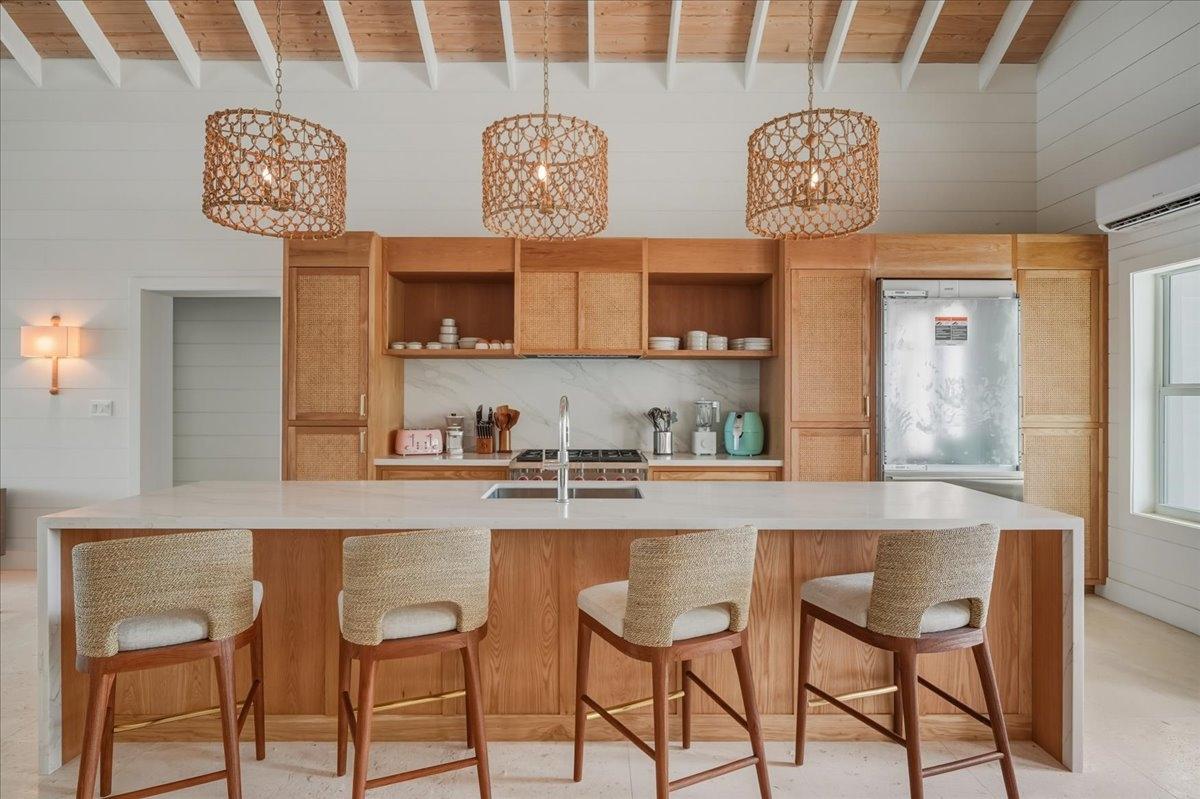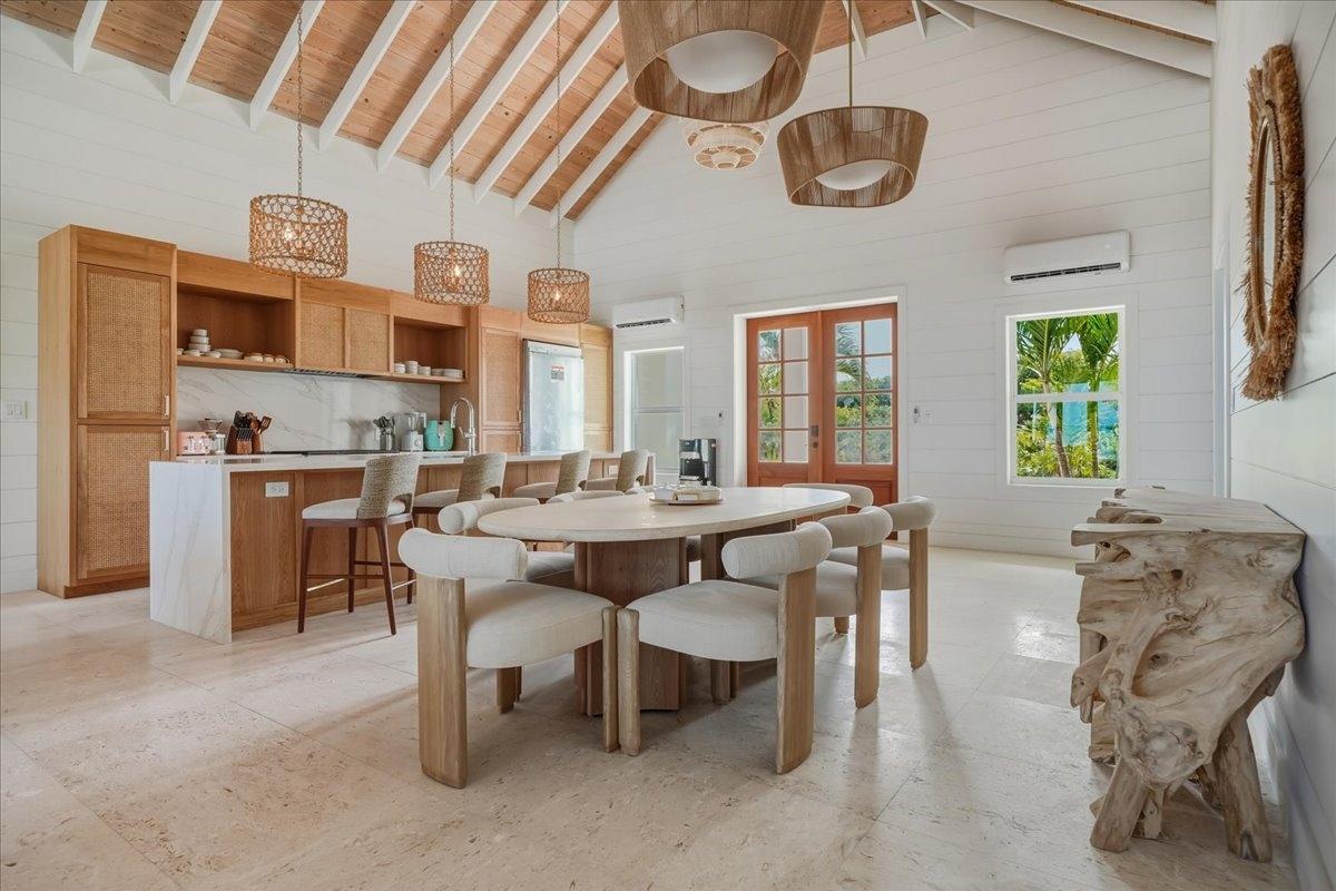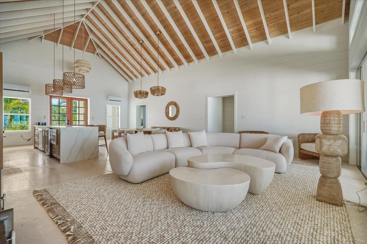 Experience Blu Wakes, an ultra-luxury five-bedroom, four-bathroom beachfront villa on the pristine shores of Hoopers Bay, Exuma — one of the most coveted stretches of beach in The Bahamas. This stunning, one-story architectural gem has been masterfully designed for modern coastal living, where refined elegance meets barefoot luxury. Step inside to discover an open-concept layout with vaulted ceilings, creating a grand sense of space and light. The modern, fully equipped kitchen with island bar and dining area flows effortlessly into the spacious living room. Two primary oceanfront suites each open to their own private terrace, offering uninterrupted sea views. The fourth and fifth bedrooms share a full bathroom, ideal for families or guests. One features a king bed and generous closet space, while the other is a bunk room with a queen and full bed, blending practicality and style for visiting friends or children. Outside, a refreshing pool sits just steps from the back terrace, kitchen, and living room — creating a seamless transition from luxury interiors to beachfront living.