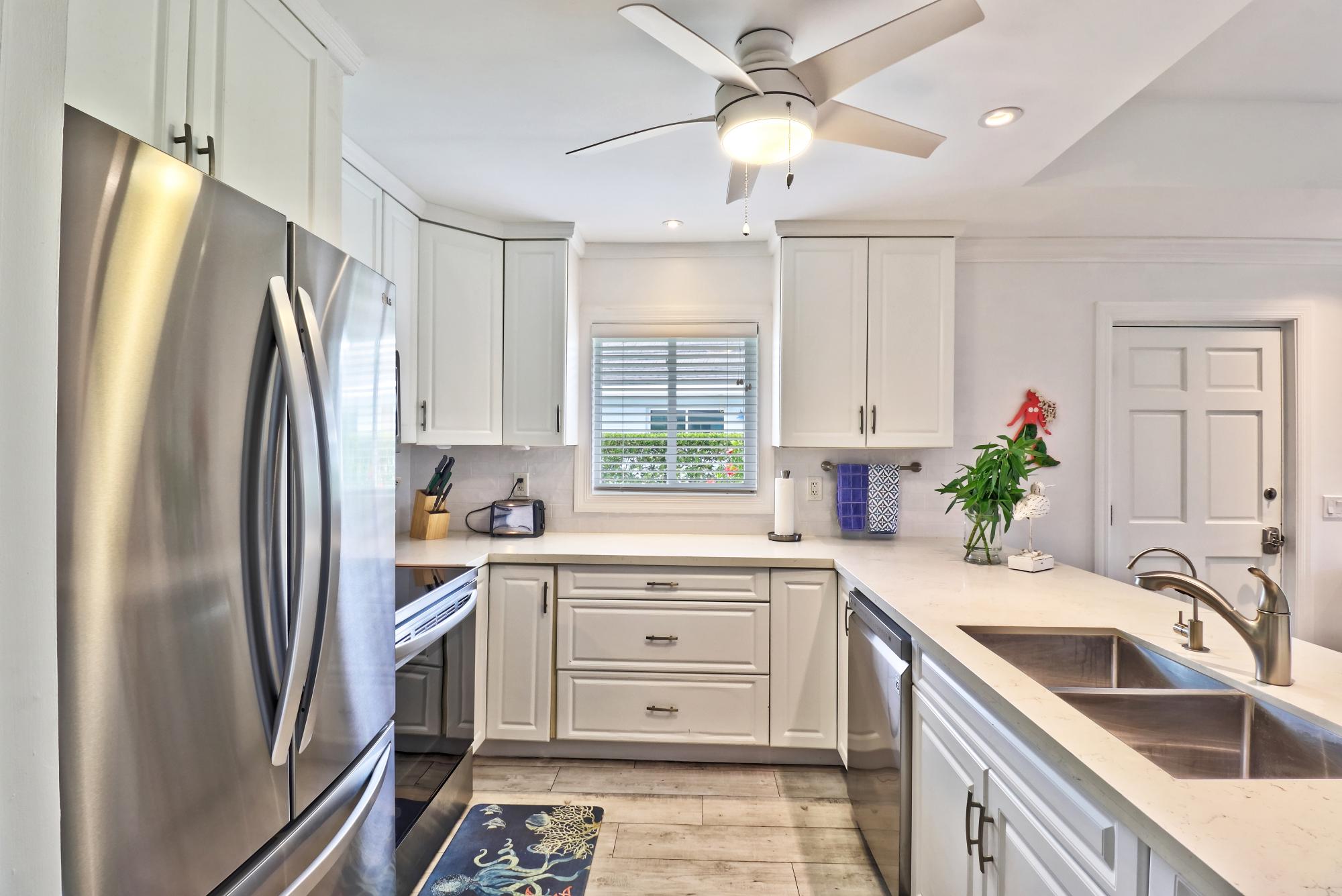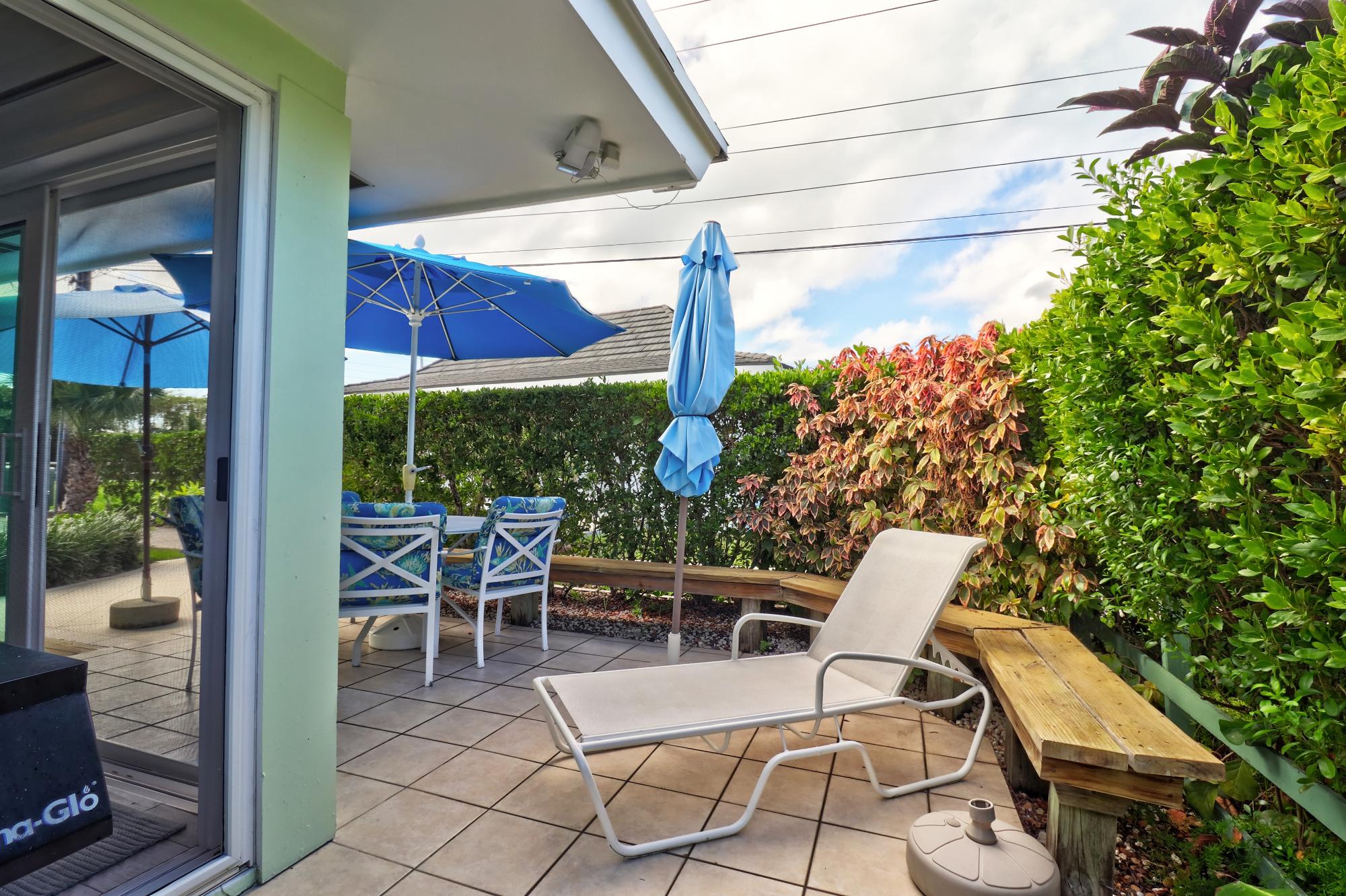 Beach Villa 504 is located on the highest elevation of the Beach Villas community and boasts some very distinctive and attractive features. Its two patios have well crafted, comfortable, built-in benches around the perimeters and its kitchen has been completely remodeled with a side breakfast table which, with its extra leaves, doubles as a large dining table when family or guests are in town. The owners wisely maximized the space by creating a proper desk nook and separating the master bedroom with French doors so that the master bed occupies a separate space from a sitting area which can double as a guest bedroom. Essentially this two bedroom villa can become a three bedroom when friends or family are visiting. Its landscaping is lush and green with a thick privacy hedge and together with its large patio umbrellas those who prefer shade can enjoy outdoor living all day long! Villa comes fully furnished (including artwork) and also has a full size stackable washer and dryer. Another bonus is the outdoor shower with privacy screen.