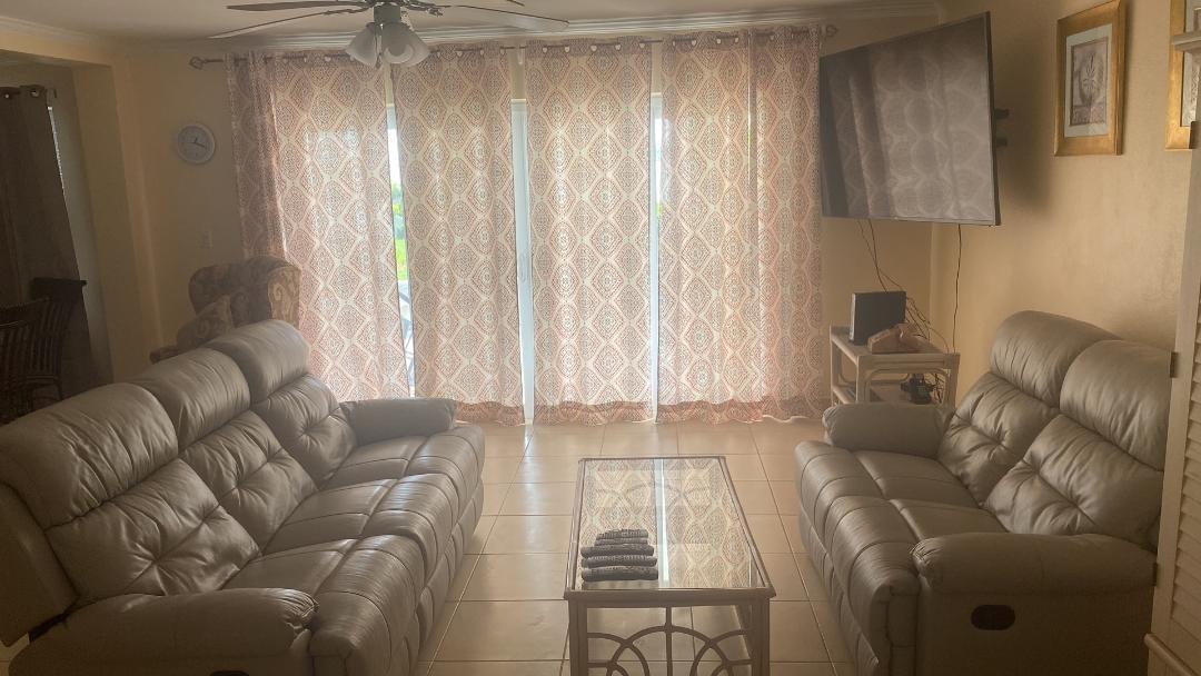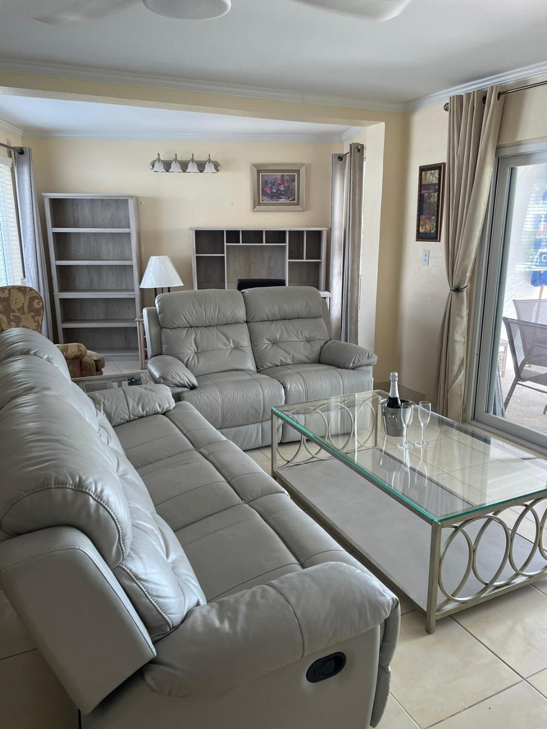3 bed, 2 1/2 bath, washer dryer, ocean front, back patio, furnished, TV, water cooler, fridge, stove, microwave, and linen.