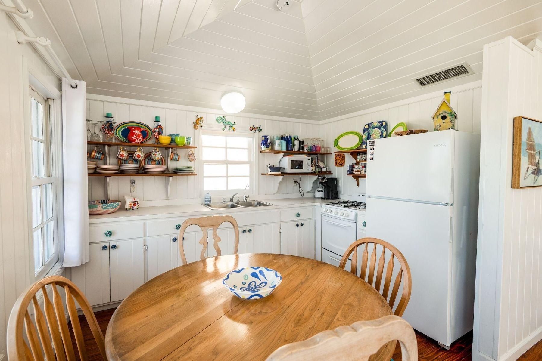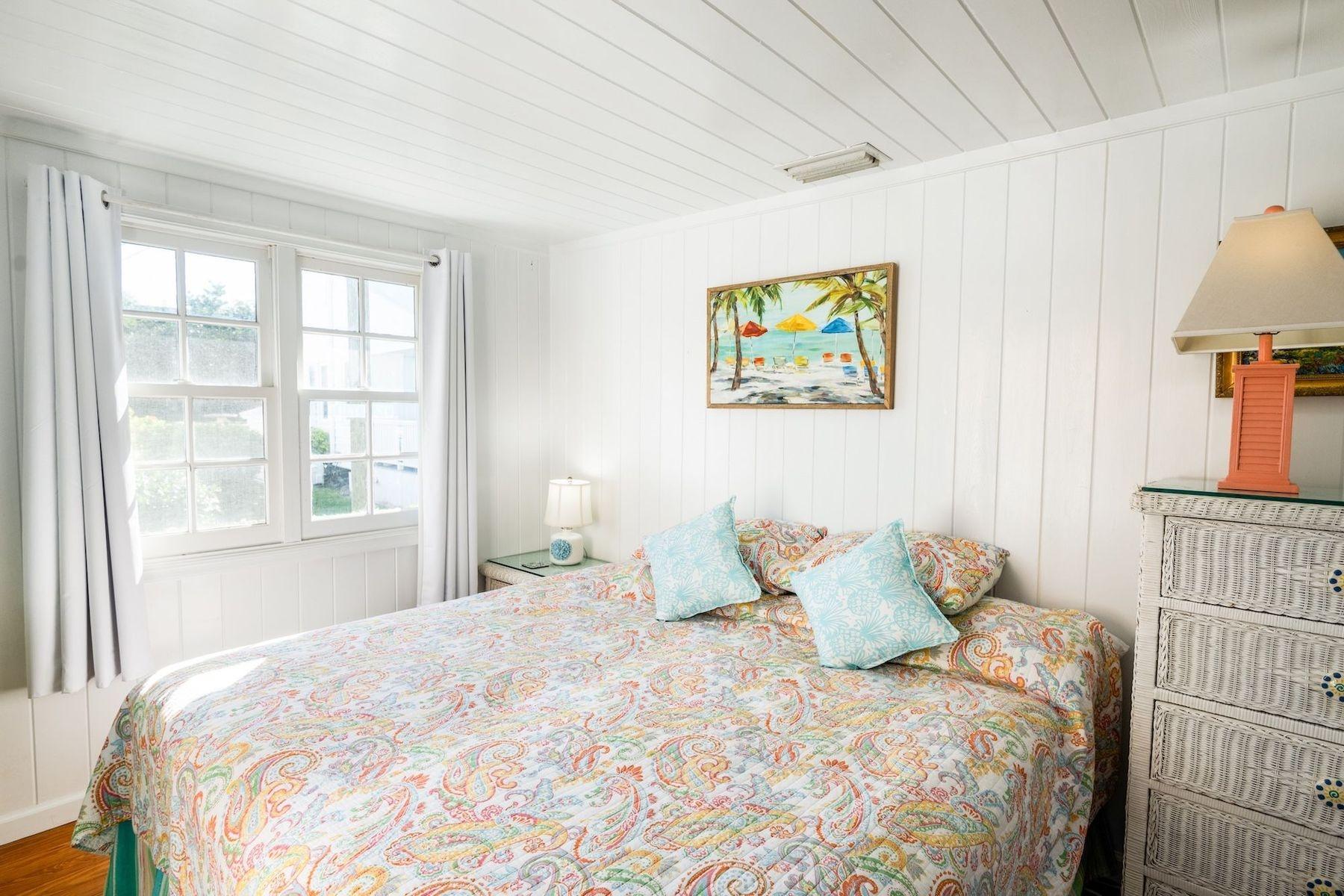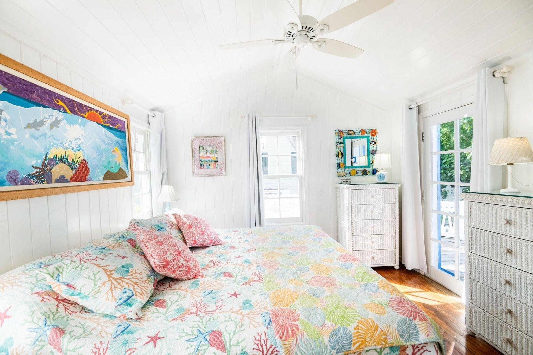 Bright, airy, and colourful home in the heart of Hope Town with postcard-perfect Elbow Reef Lighthouse views. The property has excellent storage and a flexible downstairs space, plus true boater appeal: private dock + parking and the ability to “pull your boat right up.” Layout has a kids’ bunk area, two king bedrooms—one ensuite—plus an extra full bath. Down stairs in the private bunk rooms, with access to basement, storage area for bikes & a basement with even more storage area plus a washer/dryer.