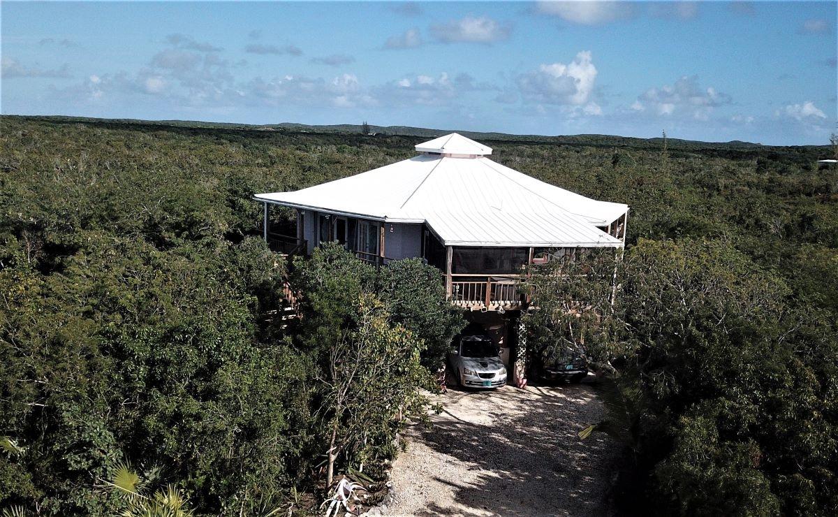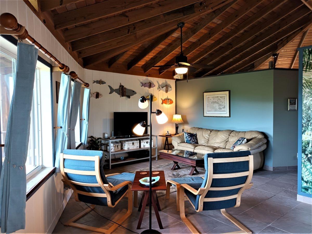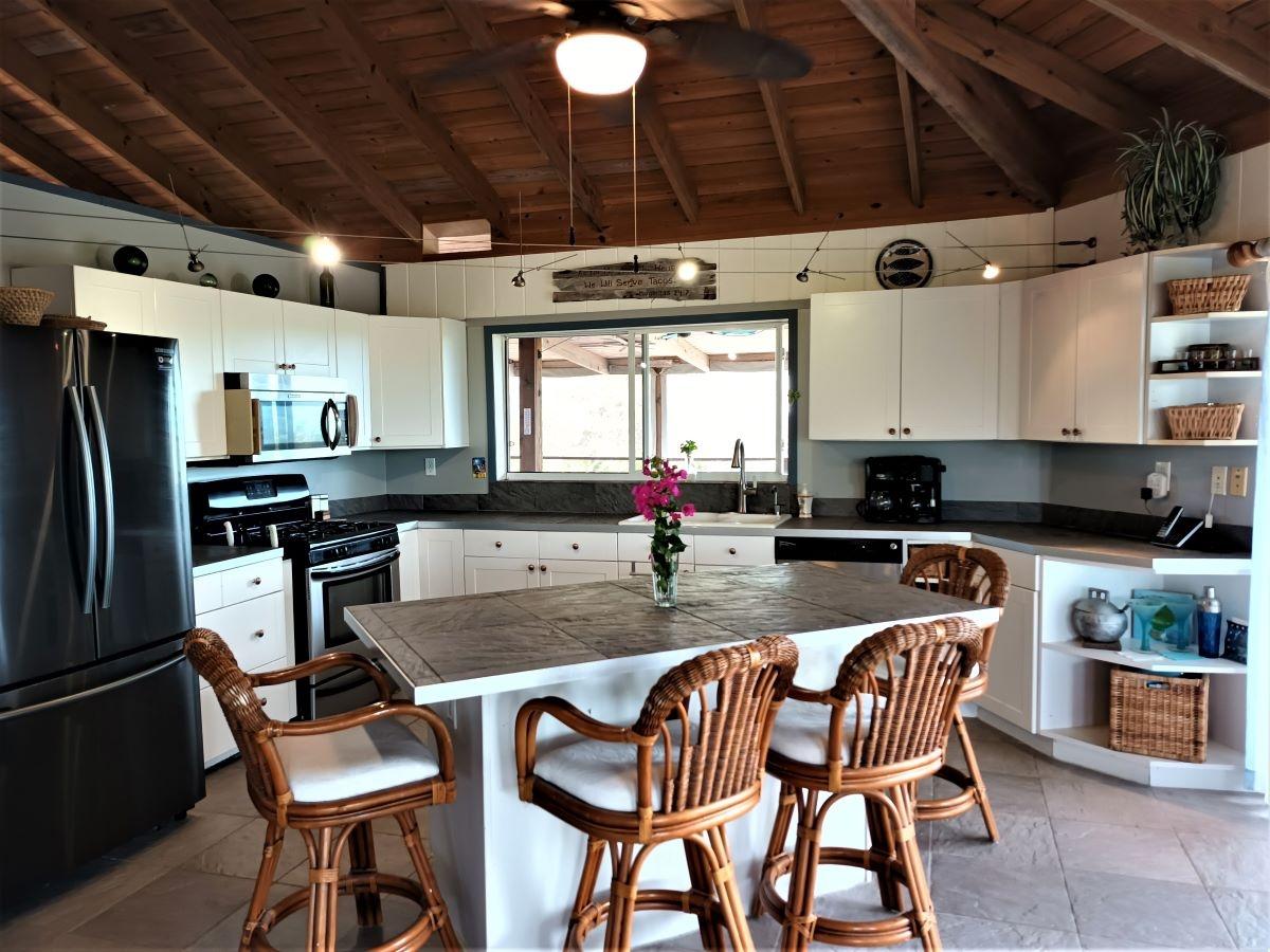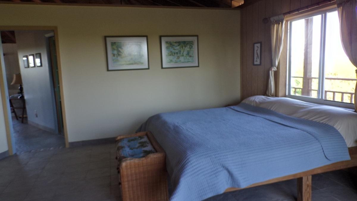 This spacious home along with a guest cottage sits in a tropical low maintenance setting with walkways between the homes where there is a hidden sundeck and garden area. This is a custom built 6-sided raised home with 360 degree views of the surrounding area including water and sunrise/sunset views. There are 2 bedrooms, 2 bathrooms, office/extra bedroom with an open plan Kitchen, dinning and living room. Ceilings are open beam with a windowed cupola, and ceiling fans. A screened in area with plenty of seating, an outdoor bar and a 7 person hot tub sits in the perfect location for the right mix of sun, shade and breeze. The ground level has a 2-car covered carport, with an additional 1,200 sq. ft. workshop, mechanicals, laundry, a bonus room with 1/2 bath. There is an 18,000 gallon cistern with plenty of storage above. The guest cottage is 600 sq. ft. with 1 bedroom, 1 bathroom, an open kitchen, dinning and living room. A screened front porch for enjoying the tropical breeze while relaxing in your hammock. There is also an outdoor shower and a 5,000 gallon cistern.