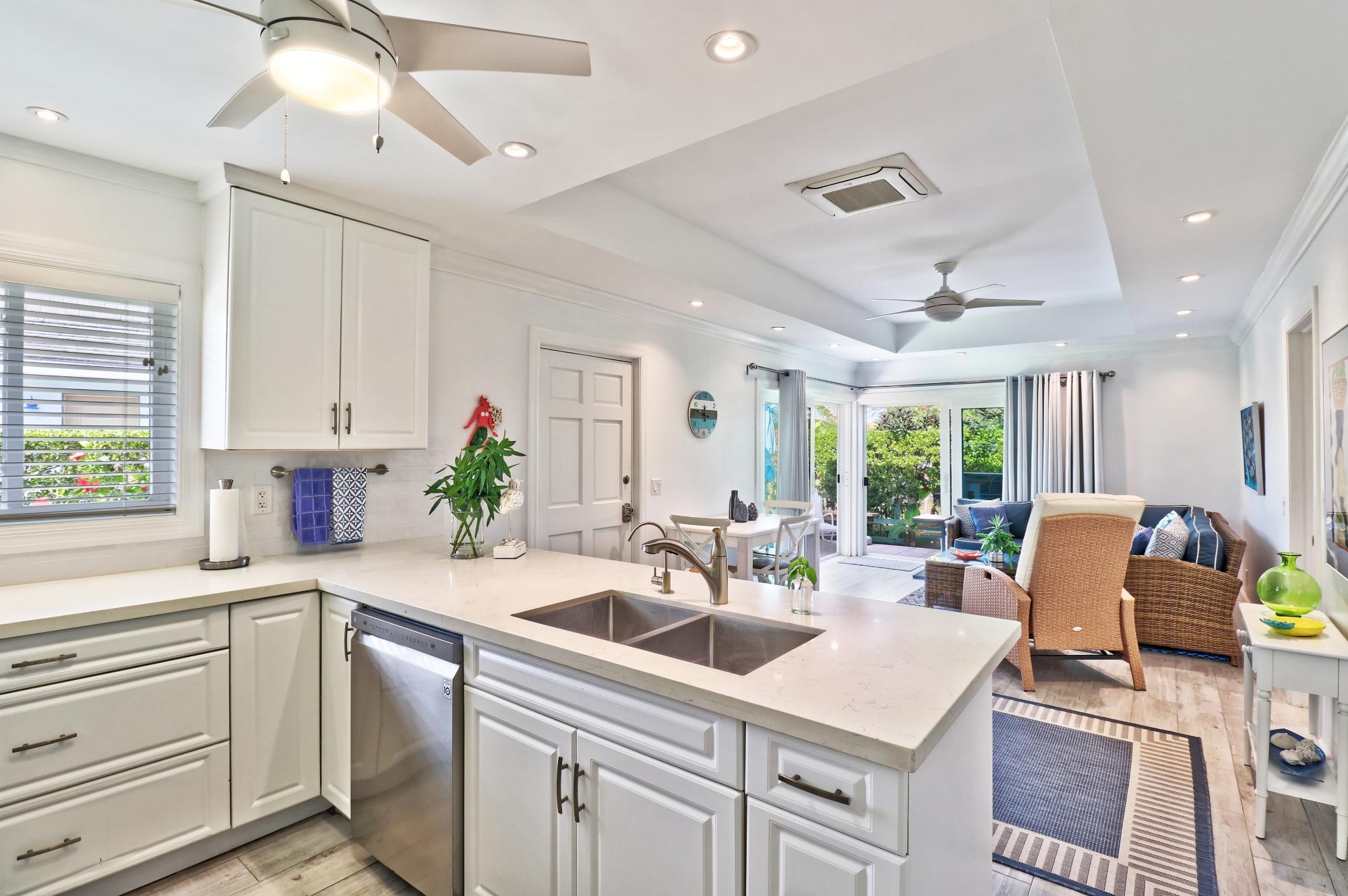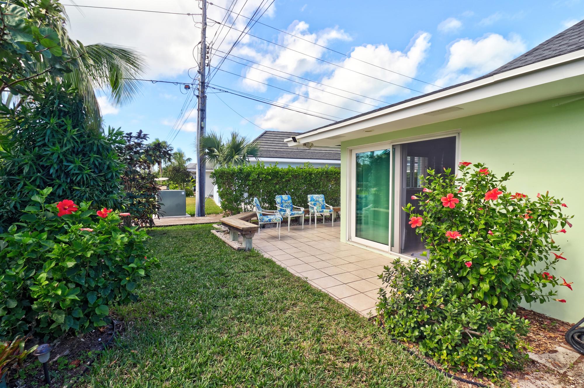 Beach Villa 504 is located on the highest elevation of the Beach Villas community and boasts some very distinctive and attractive features. Its two patios have well crafted, comfortable, built-in benches around the perimeters and its kitchen has been completely remodeled with a side breakfast table which, with its extra leaves, doubles as a large dining table when family or guests are in town. The owners wisely maximized the space by creating a proper desk nook and separating the master bedroom with French doors so that the master bed occupies a separate space from a sitting area which can double as a guest bedroom. Essentially this two bedroom villa can become a three bedroom when friends or family are visiting. Its landscaping is lush and green with a thick privacy hedge and together with its large patio umbrellas those who prefer shade can enjoy outdoor living all day long! Villa comes fully furnished (including artwork) and also has a full size stackable washer and dryer. Another bonus is the outdoor shower with privacy screen.